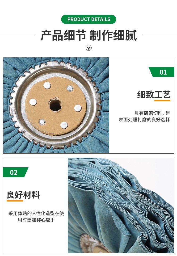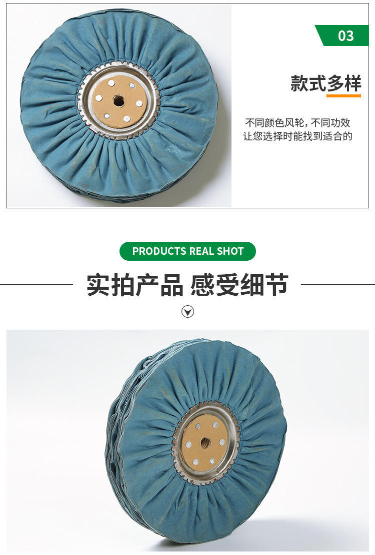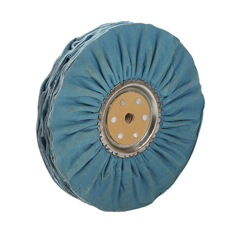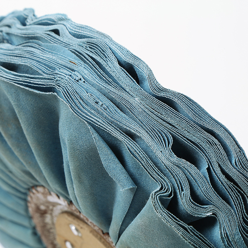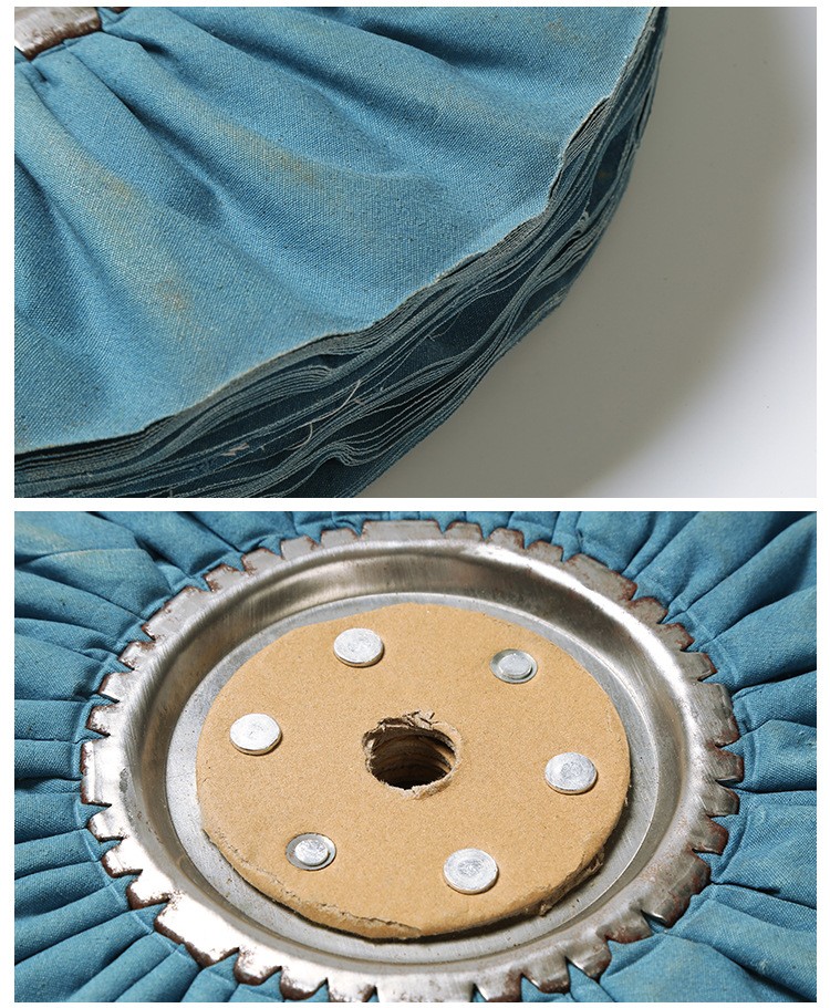 3)風冷布輪。采用45度角線裁法,呈環(huán)形皺褶狀,中間裝有金屬圓盤,具有通風散熱的特點,宜拋光大型工件。
