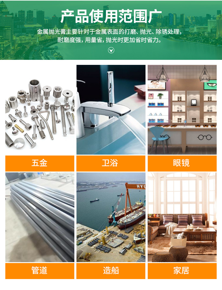 紫色拋光臘:適用于一般鋼材,如不銹鋼、不銹鐵、鐵、銅、鋁等金屬進行中至精細研磨。此產品對工件的磨削力與打磨后工件的光亮度兼顧得比較好。能撤底去除工件表面上的砂眼、氧化皮等,使工件表面平滑如鏡,并產生優良的光澤度。