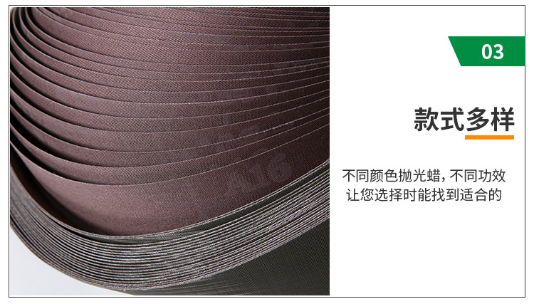 拋光臘成份主要由蠟油,氧化品,色粉等組成。主要用于金屬非金屬的表面拋光處理。拋光臘的主要成分:硬脂酸、軟脂酸、油酸、松香等粘劑,加上磨劑,如長石粉、氧化鉻、剛玉、鐵紅等,根據(jù)不同基體成分和要求制成不同的細(xì)度和品種。